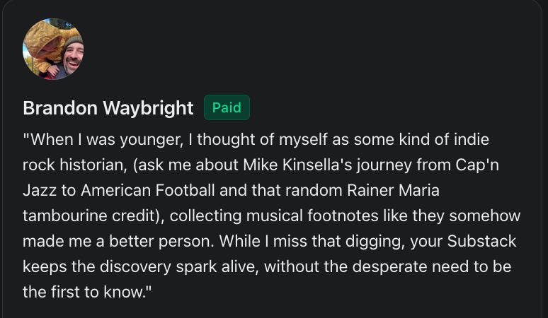 This newsletter is where all my music obsessions live: the decade-hopping connections, the tiny-band evangelism, the rabbit-hole playlists. I’m basically just a nerd you’ve handed the aux to and now I’m interrupting you every 5 seconds to say “omg you’ve gotta hear this.”
