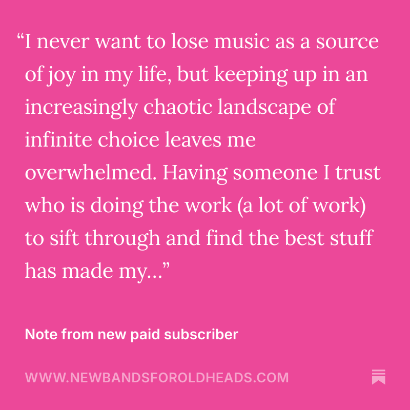Think of me as the newsletter version of the record store clerk with all the great new music recs… minus the judgy attitude.